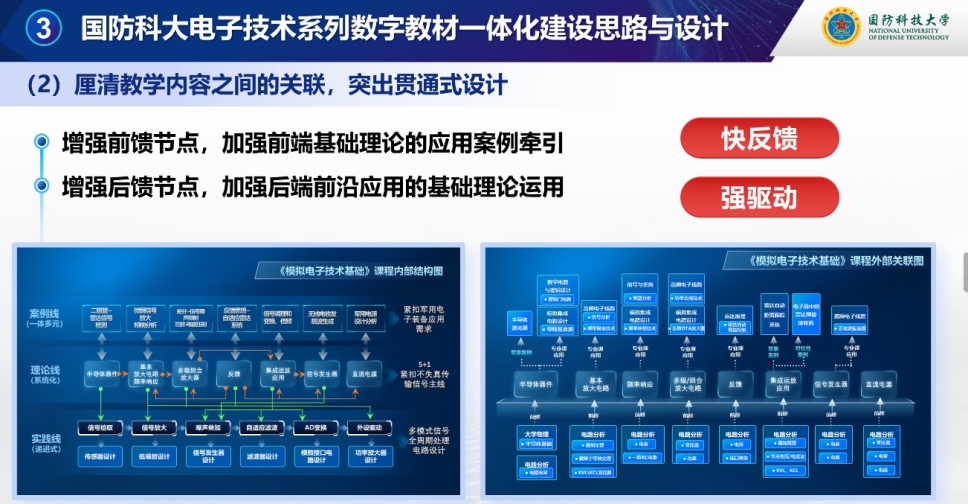 讲座中,杜湘瑜教授首先围绕“教育强国”战略背景,剖析数字教材的核心内涵与时代价值。她指出,数字教材并非传统教材“电子化翻版”,而是融合知识传递、互动体验、个性化学习于一体的教学载体,能够精准撬动“教、学、练、评”全环节变革,是实现“以员工为中心”教育理念的关键纽带。结合国防科技大学电子技术精品课程体系建设实践,杜教授详细介绍了该校电子技术系列数字教材的“一体化建设思路”,从课程目标定位、知识点拆解,到多媒体资源整合(含动画演示、虚拟仿真实验、案例库)、互动模块设计,形成覆盖 “理论学习-实践操作-考核反馈”的完整教学闭环。