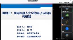 课题三负责人哈尔滨工业大学张甲教授汇报了“面向机器人安全的电子皮肤阵列研制”相关进展,压容/压阻耦合的多级力敏感研究中完成了接近觉与触觉感知的理论分析、多级力敏感结构参数的优化设计及感知过程的模拟,通过理论推导和仿真优化完成了电容/气体耦合的多级力敏感结构研究,开发了性能一致且稳定的压阻复合薄膜,采用多孔结构、金字塔结构以及高斯分布结构等多种微结构实现了6×6传感阵列的制备,提升了压容传感器检测灵敏度、提高了对微小力检测能力、拓宽了压容传感器检测量程。