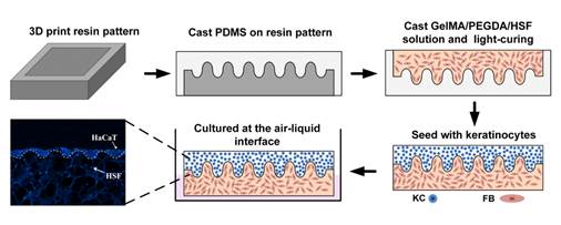 微纳系统研究中心在《材料科学与工程》(Materials Science & Engineering C)发表题为“GelMA/PEGDA共网络水凝胶构建具有网纹结构的组织工程皮肤”(Construction of tissue-engineered skin with rete ridges using co-network hydrogels of gelatin methacrylated and poly(ethylene glycol) diacrylate)的研究论文。组织工程技术与水凝胶材料的发展推动着皮肤再生研究与伤口修复的进步。研究人员利用生物相容性水凝胶材料GelMA/PEGDA,通过倒模的方法,制备了具有仿生真皮-表皮交界处网状脊结构的组织工程皮肤。