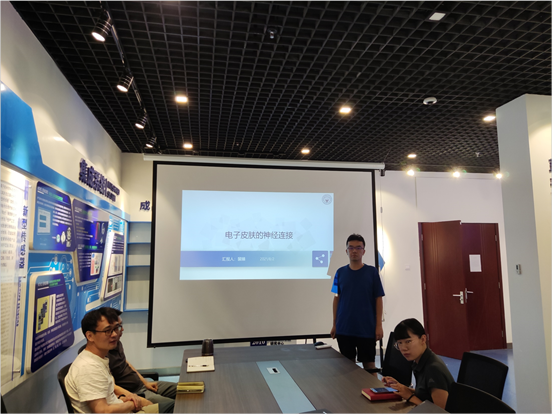 本次学术报告汇报人为裴臻博士,汇报的内容是电子皮肤的神经连接。裴臻博士结合近期较高水平的论文,介绍了当前电子皮肤神经连接的最新发展。随后分析了导电水凝胶电极和光纤电极等神经连接方法的性能优劣,并介绍了相关领域的研究成果,汇报了下一步研究的计划,参会的各位老师员工就学术报告相关内容进行了热烈的讨论。