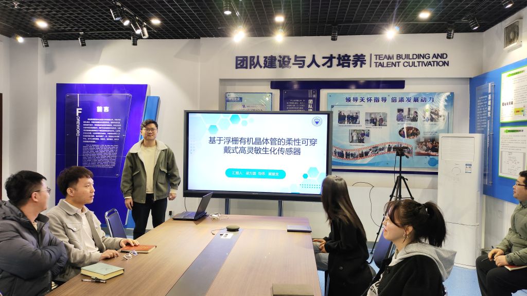 本次学术报告的汇报人为梁方圆博士,汇报的内容是基于浮栅有机晶体管的柔性可穿戴式高灵敏生化传感器。梁博士首先讲解了柔性可穿戴式OECT生物传感器的应用、OECT传感性能提高方法、OECT器件制作原理等。随后,介绍了团队的研究基础,包括浮栅有机晶体管可穿戴器件的实现,以及通过叠状沟道材料提高生物传感的方法。最后,以免疫传感为研究方向,以免疫夹心结构为技术路线,以实现浮栅结构免疫传感器制备为目标,结合团队的研究基础,介绍了相关的工作进展以及后续的研究计划。参会的各位老师员工就学术报道相关内容进行了热烈的讨论。